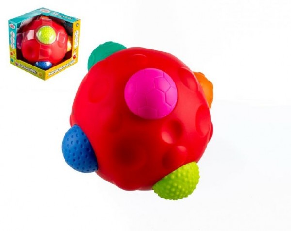 Gumový míč/vkládačka, do kterého děti vkládají 6 menších míčků. Každý z těchto gumových míčků má jinou texturu. Rozměr vkládačky: 17 cm, v krabici Rozměr menšího míčku: 6 cm Vhodné od 6 měsíců číst celé
