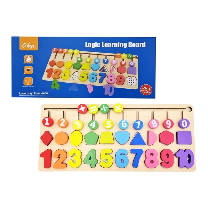 Když je učení zábavou. Dřevěná logická vkládací deska. Přiřaď číslo nebo tvar do správného otvoru. Pomocí posuvných čísel, řeš příklady. Balení obsahuje hrací desku, barevné číslice, barevné tvary, Nevhodné pro děti do 3 let.Rozměr hrací desky - 39,5 x 17,5cm