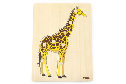 Vkládačka je vyrobena z kvalitního dřeva a motiv žirafy přitahuje pozornost svým přátelským designem. Díky přiměřené velikosti cca 30 x 22,5 cm se snadno drží i malým dětským ručkám. Děti si procvičují koordinaci oko-ruka, rozvíjejí jemnou motoriku a zároveň se učí trpělivosti a soustředění při skládání jednotlivých dílků do správných otvorů.