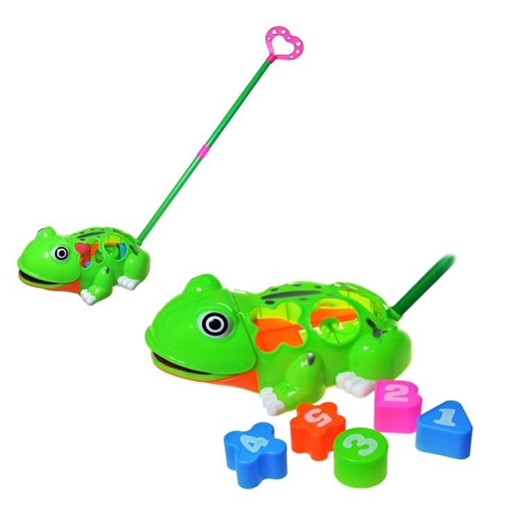 Vkládačka ve tvaru žabky na tlačení. Balení obsahuje žabku s pěti otvory na vkládání různých barevných tvarů, na kterých jsou napsány čísla.Rozměr - 24 x 10,5cm
