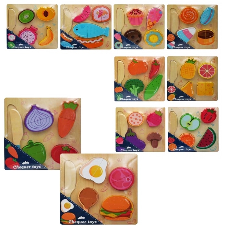 Dřevěné potraviny na krájení s nožem. Hračka slouží také jako vkládačka. Imitace ovoce, zeleniny, koláčů a jiných potravin. Možnost výběru z deseti druhů. Nevhodné pro děti do 3 let.Rozměr desky - 18x18x1, 5cm