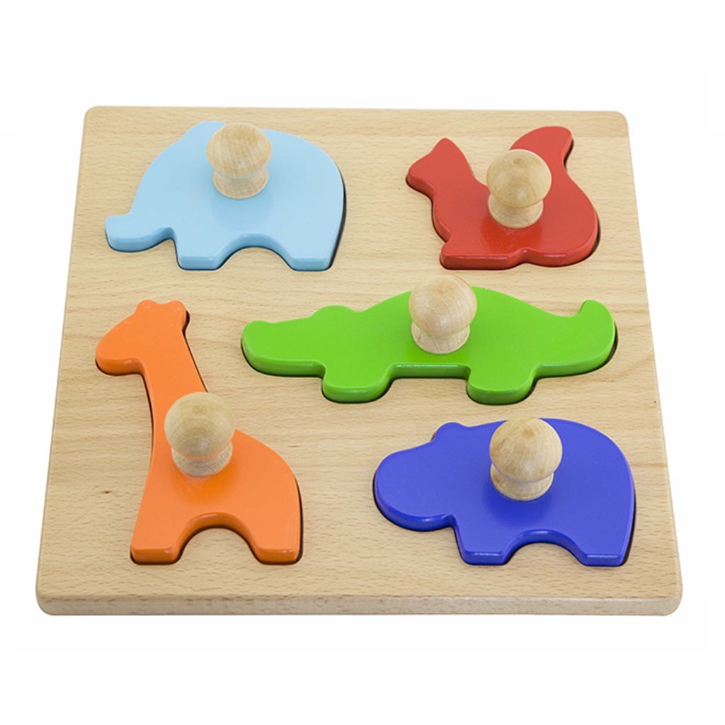 Barevná dětská dřevěná puzzle razítka s úchyty. Razítka na dřevěném podkladu slouží jako klasická puzzle vkládačka, ale zároveň obohatí hru s kinetickým pískem nebo plastelínou, do které si dítě může obtisknout jejich tvar. Dětem se díky úchytům puzzle lépe drží v prstech a snáze se vkládájí do určených míst. Balení obsahuje 5 dílků. Určeno pro děti od 12 měsíců. Naší prioritou je bezpečnost a kvalita našich výrobků, a proto barvy použité na hračkách nejsou toxické a splňují bezpečnostní standardy (EN71 a ASTM). Hračka je vhodná jako krásný dárek pro naše nejmenší. Rozměr cca:24x24x5cm