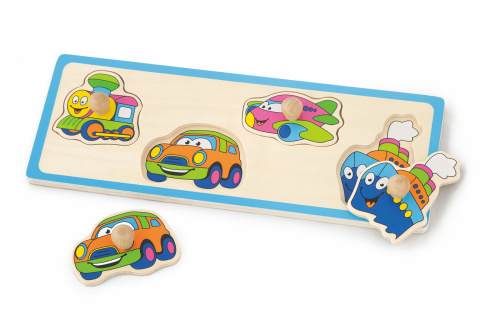 Dřevěná vkládačka s dopravními prostředky. Rozměry dřevěné desky cca 30 x 11 cm x 1 cm,kde jsou umístěny 4 druhy dopravní prostředky s úchyty. Věk 12m+