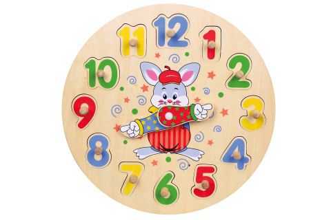 Dřevěné hodiny pro snadnou výuku. Hodiny slouží také jako vkládačka. Balení obsahuje 12 dílků. Rozměry cca 30 x 30 x 2 cm. Věk 24m+