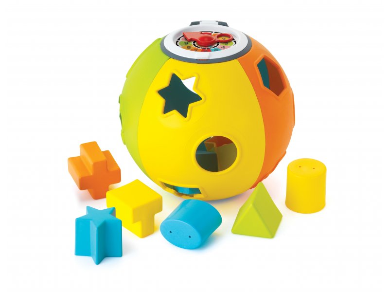 Hračka v podobě barevné koule obsahuje 12 různobarevných vkládacích tvarů, odpovídajících otvorům na povrchu hračky. Součástí kulatých dvířek pro přístup k obsahu koule jsou hodiny s otočnými ručičkami.
