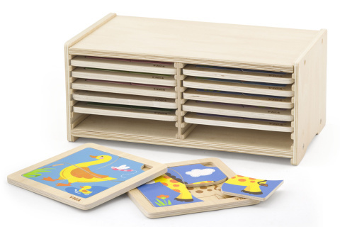 Sada 12 kusů dřevěných puzzlí v praktickém dřevěném boxu. Rozměry boxu cca 31,5 x 17,5 x 13,5 cm. Rozměry balení cca 32,5 x 17 x 14 cm. Věk 18m+