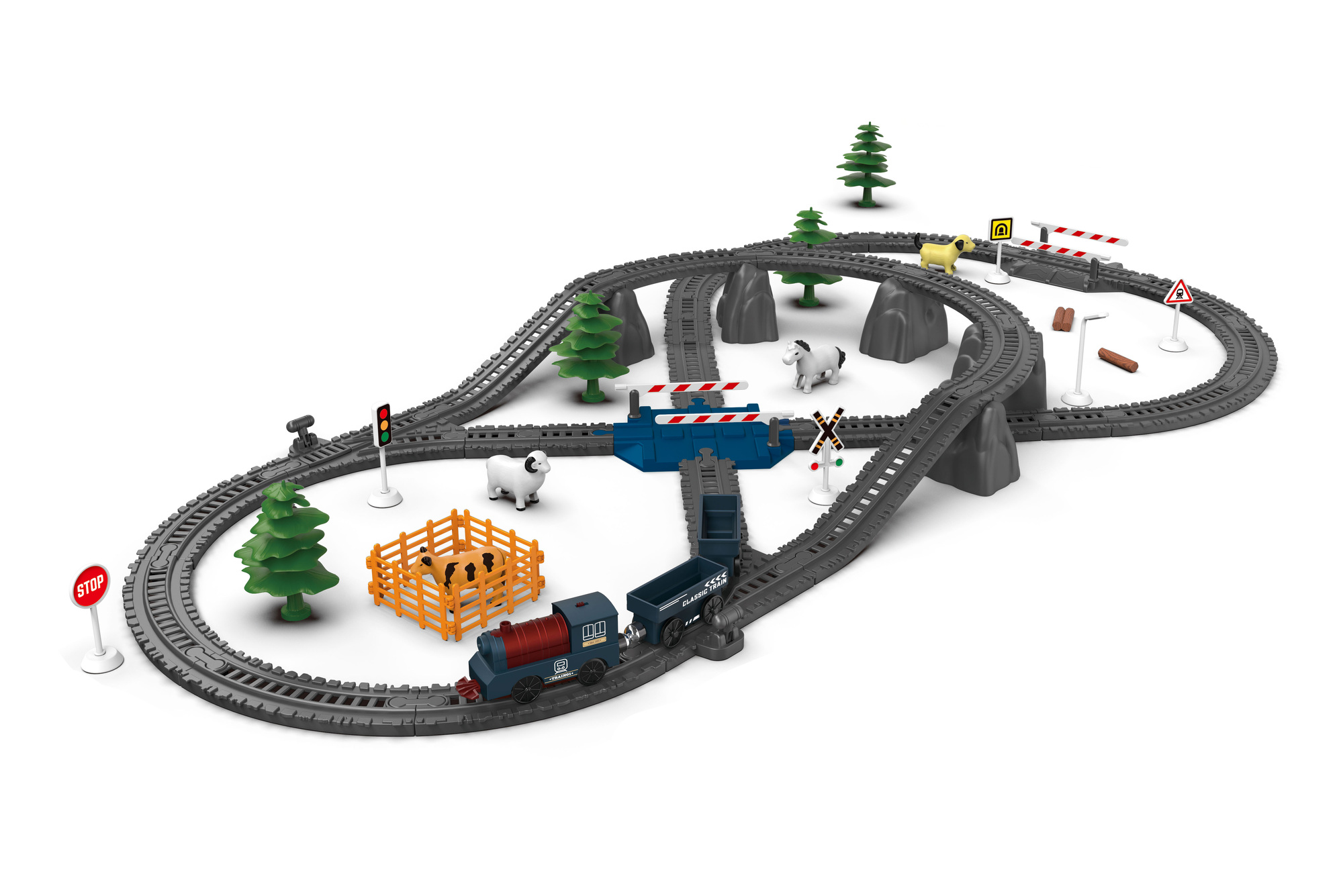 Vlak trať s efekty. Rozměry sestavené trati 112x61x7,5 cm. Vláček je propojený magnety. Trať vydává zvukové efekty. Aktivace přepínačem na mašince - směrová tlačítka pro jízdu v daném směru. Část trati aktivuje zvukové efekty, 1x3V CR2032 baterie jsou součástí. Vláček - 1xAA (1,5V), není součástí. Sada se skládá z 90 dílků.