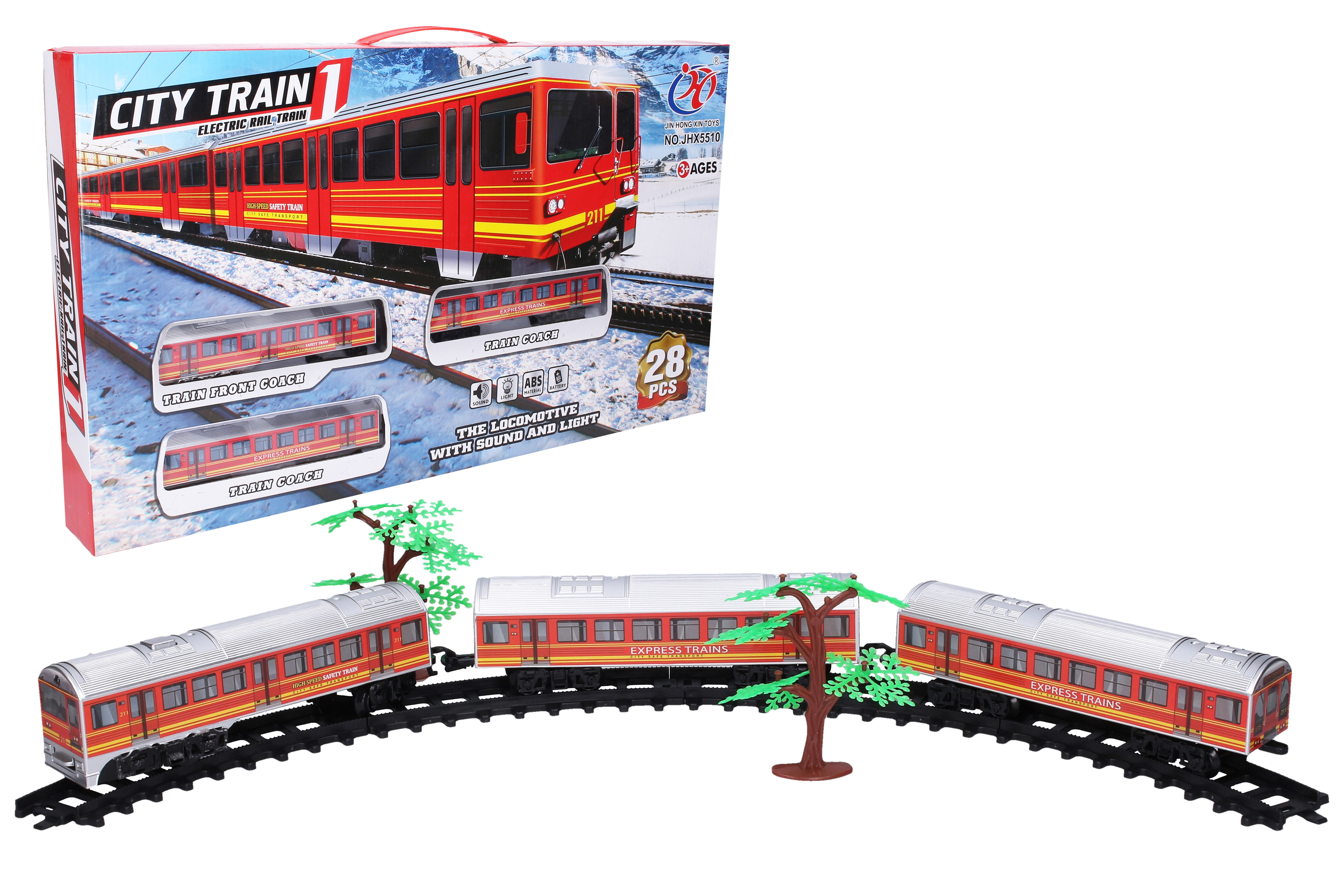 Vlak s tratí. Průměr trati 111 cm. Trať lze zkrátit na 88 a 70 cm. Světelné a zvukové efekty. 28 dílů. číst celé