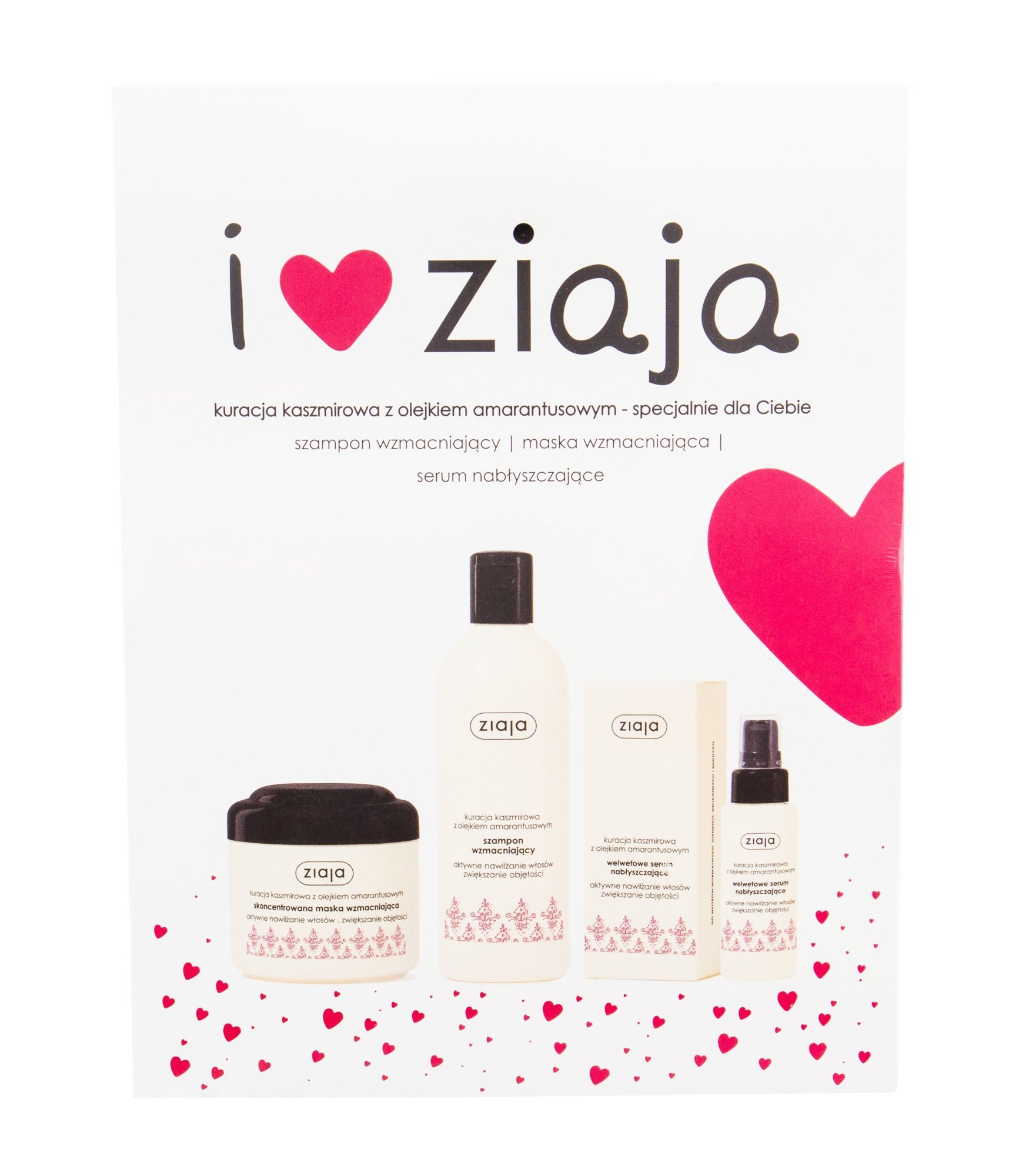 Dárková sada pro oslabené vlasy **Ziaja Cashmere.** **Složení kazety:** Posilující šampon na vlasy **Ziaja Cashmere Proteins & Amaranth Oil 300 ml.** Šampon pomáhá posilovat slabé, jemné a suché vlasy díky složení obohacenému o kašmírové proteiny a amarantový olej. Posiluje vlasovou strukturu. Chrání vlasy před lámavostí a křehkostí. Hloubkově hydratuje. Lehké složení dodává vlasům objem. S pravidelným používáním masky z řady Cashmere budou Vaše vlasy lesklé, silné a pružné. **Použití:** Aplikujte do mokrých vlasů. Jemnou masáží napěňte. Poté důkladně opláchněte. Posilující maska na vlasy **Ziaja Cashmere Proteins & Amaranth Oil 200 ml.** Maska pomáhá posilovat slabé, jemné a suché vlasy díky složení obohacenému o kašmírové proteiny a amarantový olej. Posiluje vlasovou strukturu. Uzavírá vlasovou kutikulu. Chrání vlasy před lámavostí a křehkostí. Zvyšuje jejich pružnost. Usnadňuje rozčesávání. S pravidelným používáním masky z řady Cashmere budou Vaše vlasy lesklé, silné a pružné. **Použití:** Aplikujte do ručníkem vysušených vlasů. Nechte působit 3 - 5 minut. Důkladně opláchněte. Posilující sérum na vlasy **Ziaja Cashmere Proteins & Amaranth Oil 50 ml.** Maska pomáhá posilovat slabé, jemné a suché vlasy díky složení obohacenému o kašmírové proteiny a amarantový olej. Posiluje vlasovou strukturu. Uhlazuje vlasové vlákno. Dodává vlasům hydrataci. Chrání suché konečky vlasů před třepením a přesušením. Zvyšuje jejich pružnost. Usnadňuje rozčesávání. Se sametovým sérem na vlasy z řady Cashmere budou Vaše vlasy lesklé, silné a pružné. **Použití:** Rozehřejte 1 - 2 dávky ve svých dlaních. Rovnoměrně aplikujte zejména do délek a konečků vlasů. Neoplachujte. Lze použít jak za sucha tak za mokra.