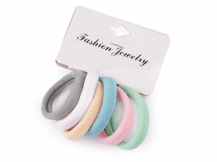 Gumičky do vlasů vypadají díky všitým lurexovým vláknům velice elegantně. Jemně se třpytí. Jsou vhodné na vytvoření jednoho či více copů. Gumičky výborně drží na hrubých i jemných vlasech. V jedné sadě je 6 gumiček. Vnitřní průměr gumičky je cca 3,5 cm a maximální délka obvodu po roztažení je cca 16 cm.