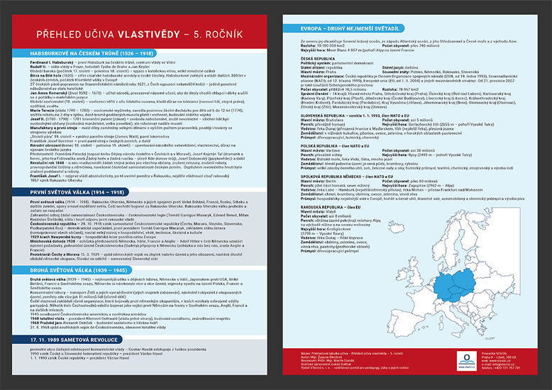 Přehledová tabulka – Vlastivěda I. (5. ročník) - přehled učiva - obsahuje přehled historie od nástupu Habsburků po současné dějiny a ucelený přehled základních informací o České republice a Evropě.