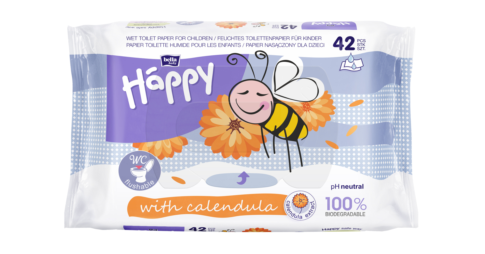 Vlhčený toaletní papír Happy s měsíčkem lékařským á 42 ks dokonale čistí pokožku. Obsahuje výtažek z měsíčku lékařského, zklidňuje podráždění a podporuje regeneraci a obnovu pokožky. Pomáhá vyživovat a hydratovat pokožku a přináší pocit svěžesti a čistoty. Neobsahuje alkohol, je pH neutrální. Lze spláchnout do toalety, biologicky rozolžitelný.