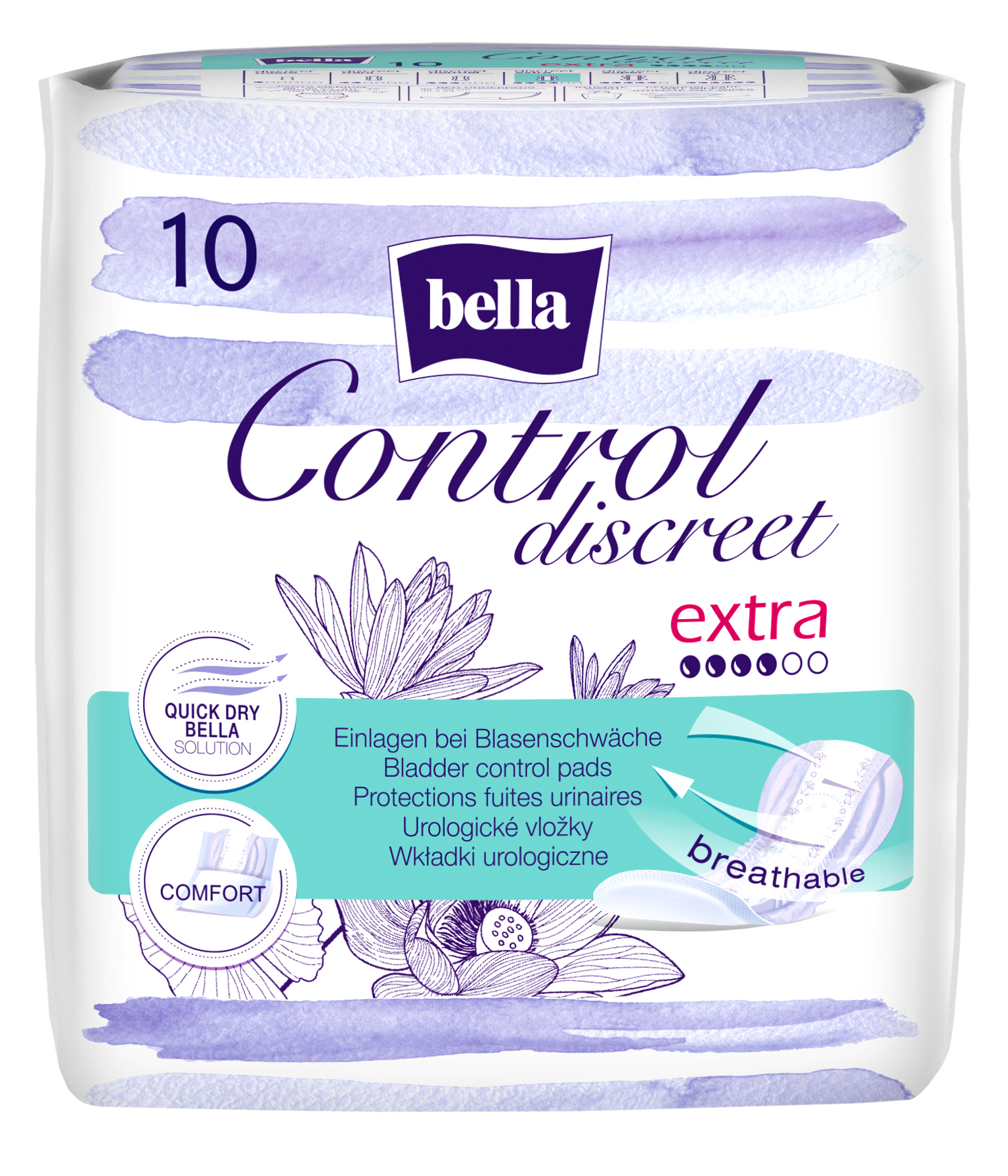 Bella Control Discreet Extra jsou prodyšné urologické vložky určené pro lehkou inkontinenci. Díky vynikající absorpční schopnosti a jemnému měkkému povrchu zaručují vložky prodyšnost a ten nejlepší komfort během celého dne. Jejich tvar jedokonale přizpůsobený lidskému tělu a široký lepicí pásek pevně přilne ke spodnímu prádlu, které chrání speciálně uzpůsobené okraje vložek. Systém EDS zajistí, aby se moč neshromažďovala pouze na jednom místě, ale po celém obvodu, a ODOUR STOP systém zamezí vzniku nepříjemného zápachu moči.
