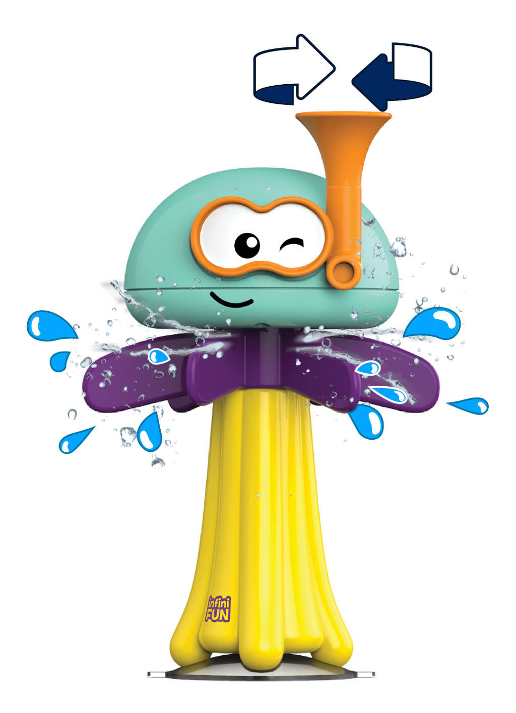 Zábavná chobotnička do vany rozstřikující vodu. Stačí jen točit šnorchlem a voda bude stříkat všude. Zespodu má chobotnička přísavku k připevnění na vanu.