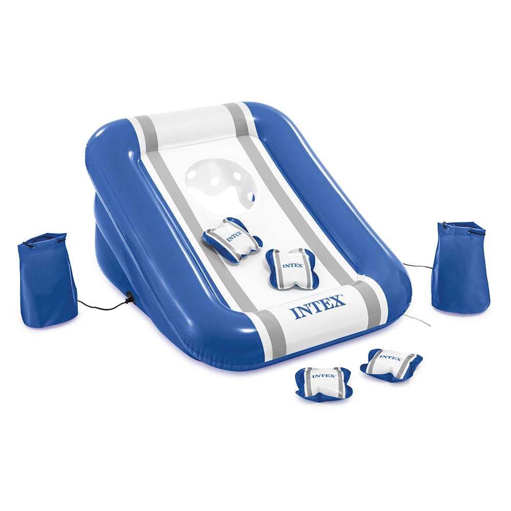 Nafukovací házecí hra z nové kolekce Intex 2018 má rozměr 86 x 71 x 42 cm. Tuto parádní hru si můžete zahrát jak ve vodě, tak i na trávníku. Sada obsahuje čtyři vaky, které se naplní vodou a hráči se je snaží hodit do otvoru v plováku. Vše je vyrobeno z kvalitního a zdravotně nezávadného vinylu o síle 0,25 mm. Součástí balení je také případná opravná lepící sada.