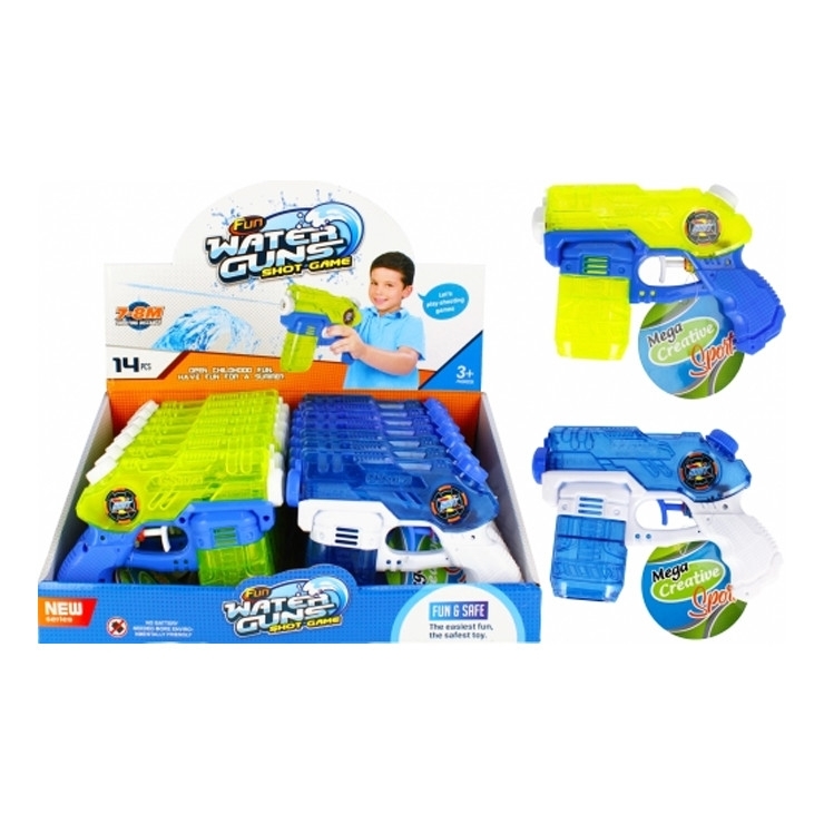 Barevná vodní pistole, na výběr ze dvou variant. Rozměry produktu jsou 17 x 12 x 4 cm. Baleno po 14 kusech. Cena je za 1 kus. Produkt je určen pro děti ve věku 3+.