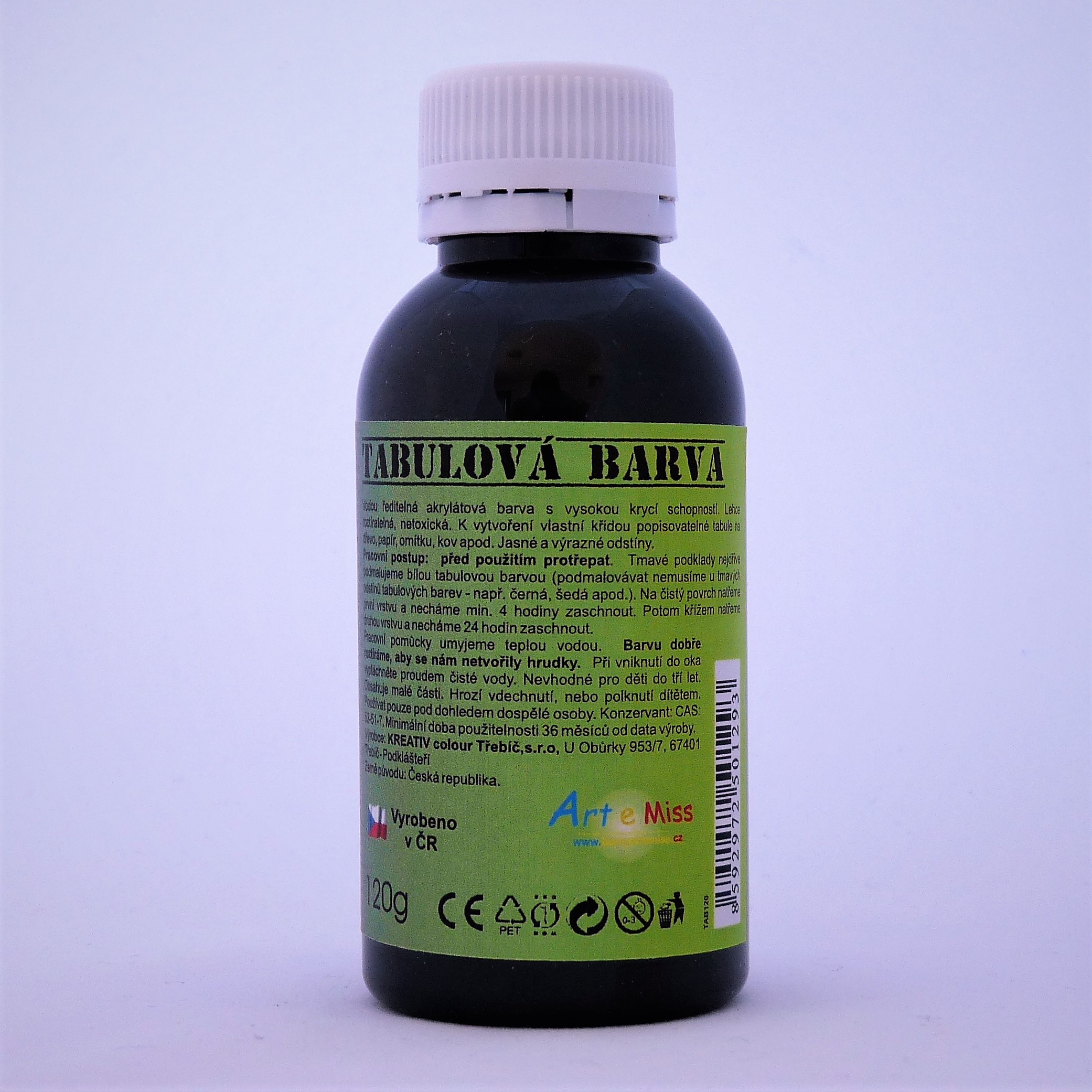 Vodou ředitelná akrylátová barva s vysokou krycí schopností. Lehce roztíratelná, netoxická. K vytvoření vlastní křidou popisovatelné tabule na dřevo, papír, omítku, kov apod. Jasné a výrazné odstíny.