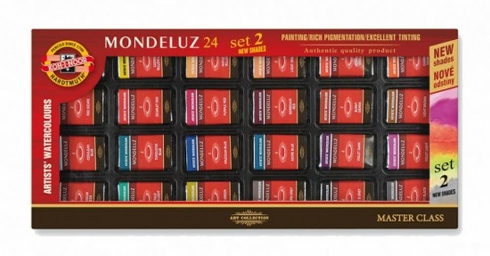 Akvarelové barvy MONDELUZ jsou transparentní s jasnými odstíny, s velmi malou kryvostí určené pro malování vlasovým štětcem technikou akvarelu. Dodávány jsou pevném stavu ve formě kyvetek z umělé hmoty zabalené v hliníkové fólii označené etiketou. Jejich