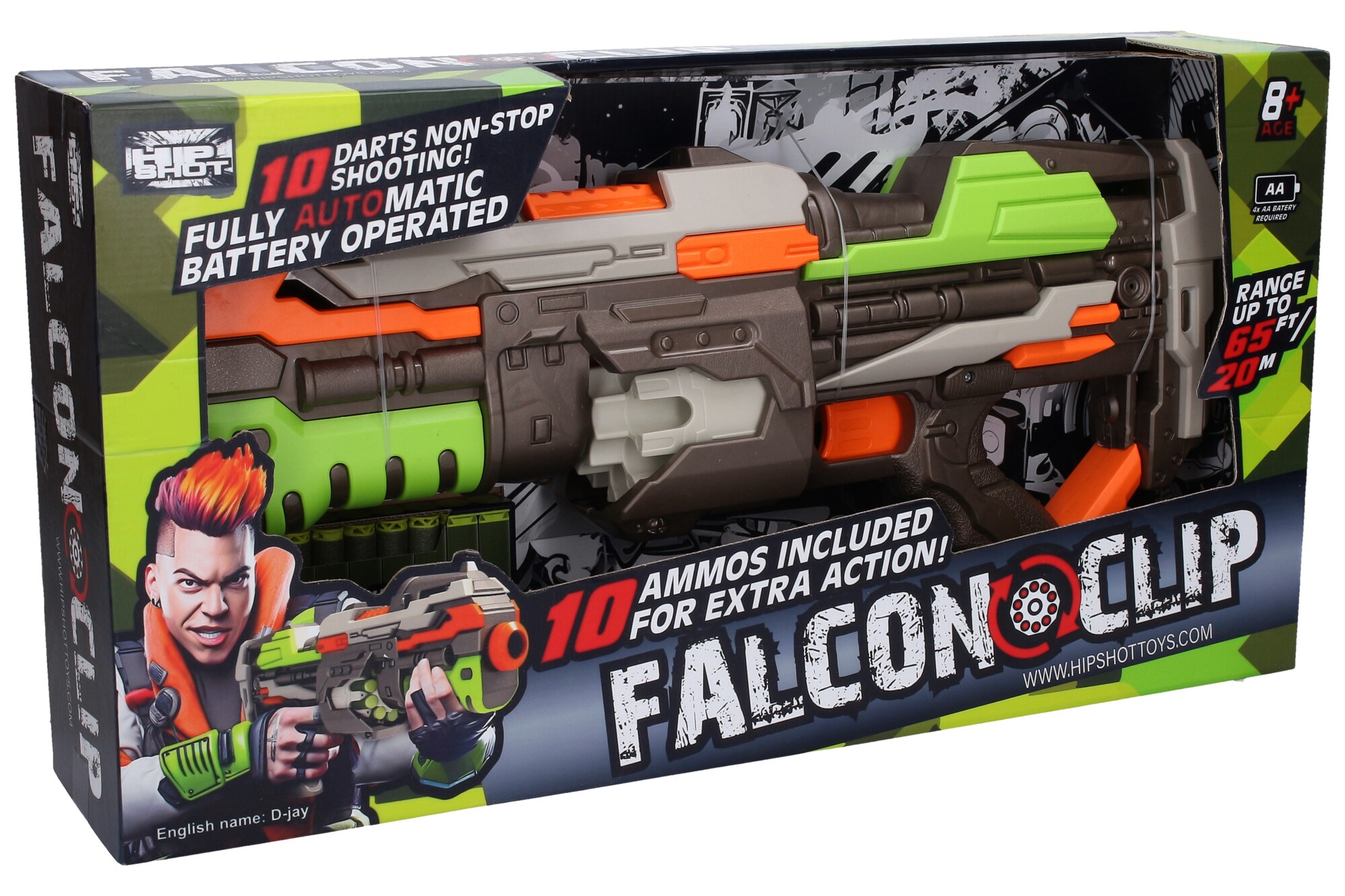 Puška s 10 pěnovými náboji. Rozměry 45x8,5x22 cm. 4xAA baterie součástí. Přepínač ON/OFF nad rukojetí. Dostřel 20 m. Obrázkový návod s popisem na zadní části obalu. číst celé