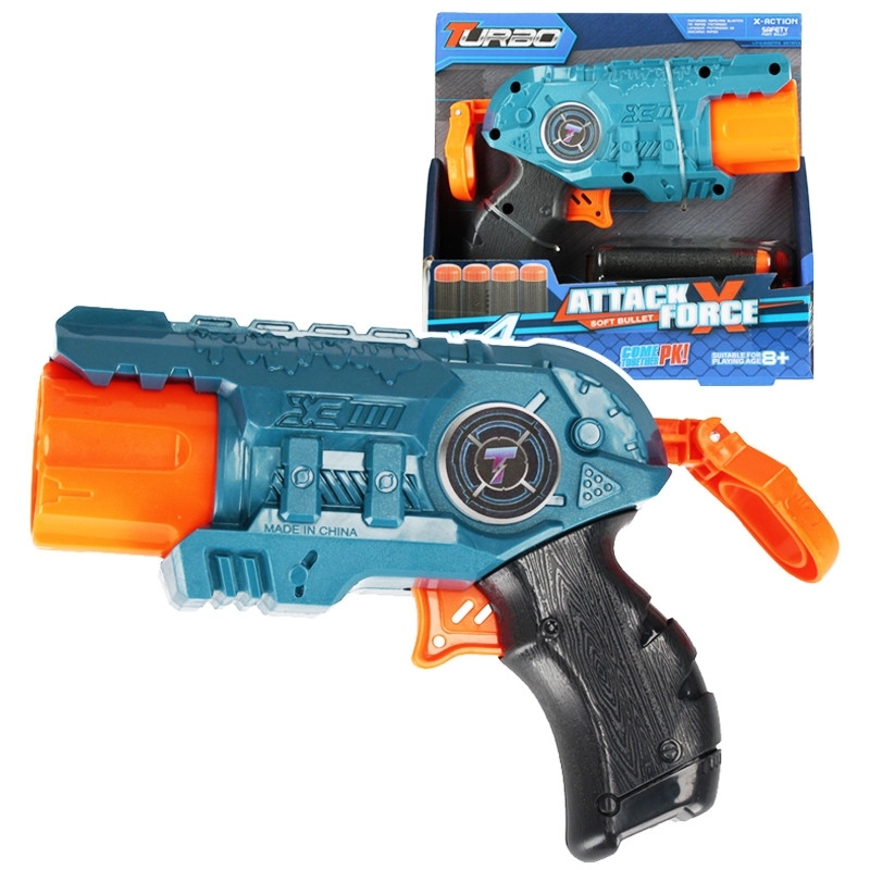 Pistole s pěnovými náboji, má rozměry 16X16X6 cm. Obsah sady je pistole, 4x pěnové šipky. Cena je za 1 sadu. Vhodné pro děti 3+.