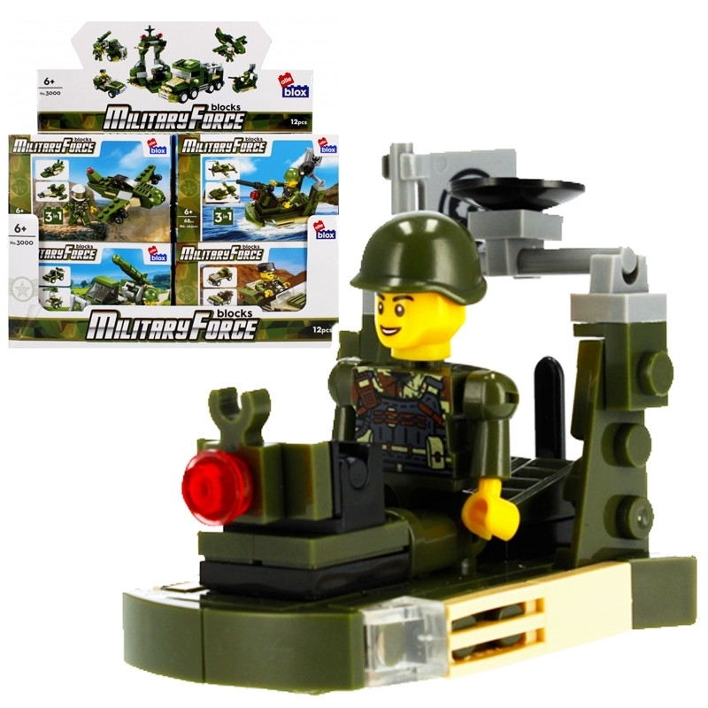 Vojenské vozidlo s panáčkem Stavebnice, má rozměry 9x6x10 cm. Na výběr ze čtyř variant. Baleno v boxu po 12 ks. Cena je za kus, který obsahuje od 63 do 64 prvků a montážní návod. Vhodné pro děti 6+. číst celé
