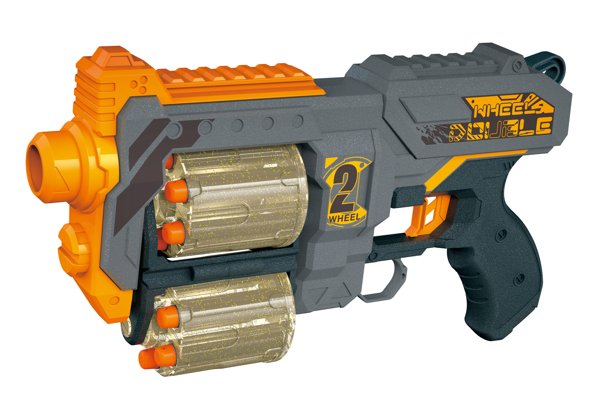 Pistole Wheel Double s pěnovými náboji. Rozměry 32,5x19x6,3 cm. Součástí 20 pěnových nábojů (5 standardních, 5 s přísavkou). Obrázkový návod s popisem na ovládání na zadní straně obalu. Střelba vložením náboje do zásobníků, natáhnutím mechanismu v zadní části zbraně, stiskem spouště. číst celé