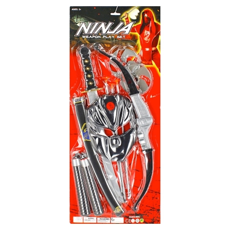 Souprava Ninja Sada obsahuje: meč, masku, luk + 3 šípy, hole s řetězem. : rozměry produktu (délka) [cm]: meč - 50 cm, maska - 15x20x2, rozměry balení (délka x výška x hloubka) [cm]: 30x70x4, Hračka je určena pro děti ve věku 3+. Souprava je balena na blistru.