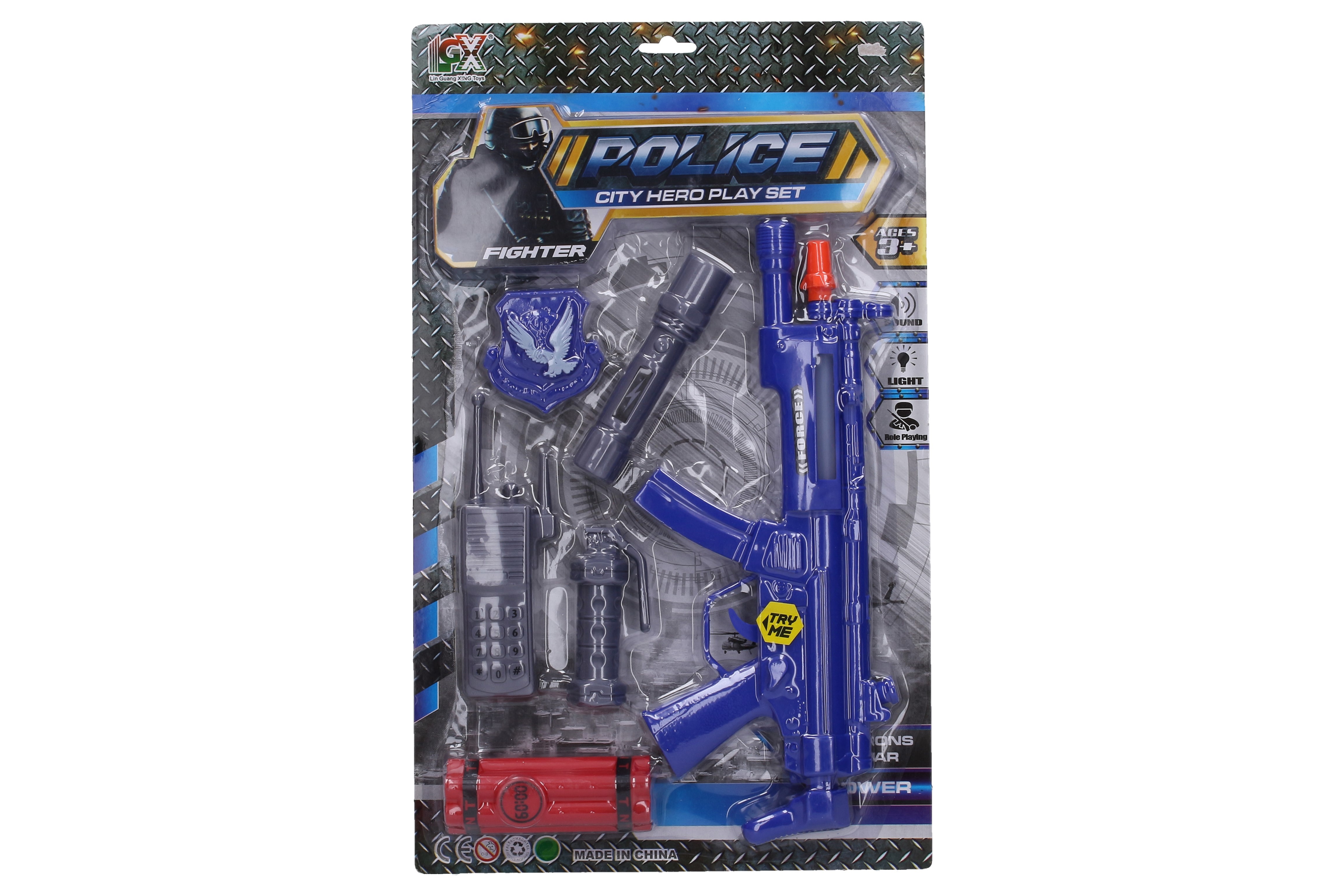 Vojenský set s efekty. Součástí puška, svítilna, odznak, vysílačka, granát, dynamit. Puška se světelnými a zvukovými efekty. 3xAG13 baterie součástí.
