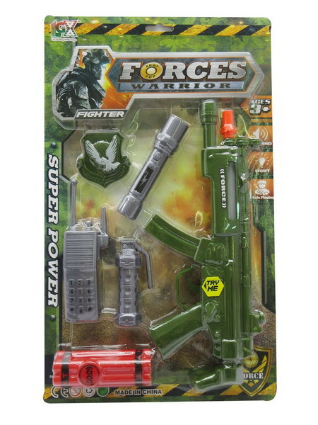 Vojenský set. Rozměry pušky 30x14 cm. Součástí puška, odznak, svítilna, vysílačka, granát, dynamit. Světelné a zvukové efekty pušky. 3xAG13 baterie součástí.