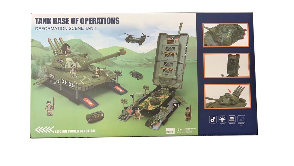Hrací set ve tvaru tanku. Světelné a zvukové efekty. Sada obsahuje 4 kovová vojenská autíčka a doplňky. číst celé