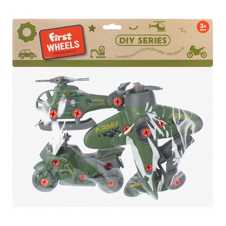 Set vojenský, má odšroubovací prvky. Sada obsahuje letadlo, vrtulník, motorku a šroubovák. Rozměry balení jsou 33x29x9cm. Výrobek je určen pro děti ve věku 3+. Baleno v tašce s věšákem. číst celé