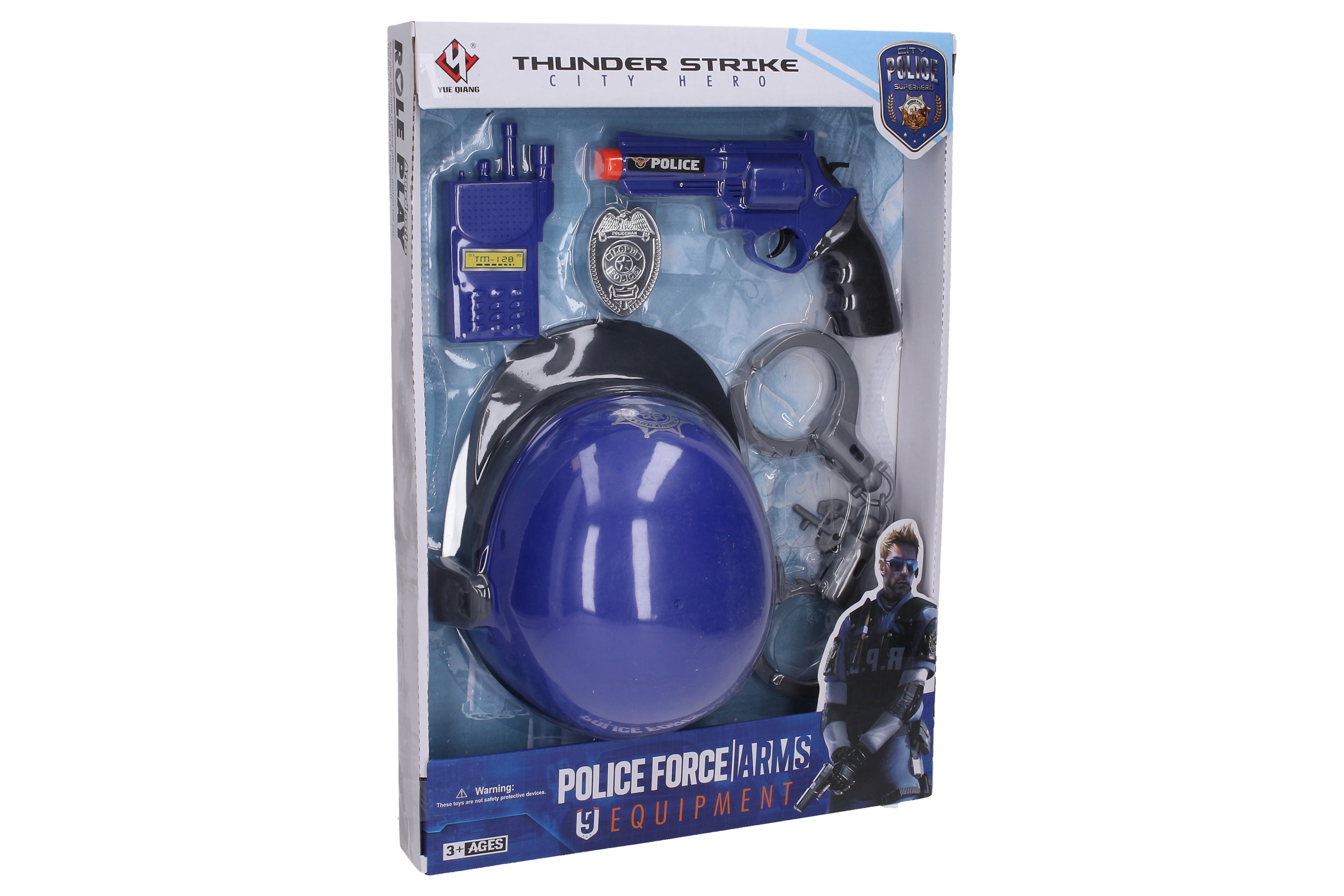 Policejní sada s přilbou 26 x 22 cm. Obsah balení - pistole 20cm (akustické zvukové efekty), policejní odznak, vysílačka, pouta s klíčem, přilba 26x22 cm.