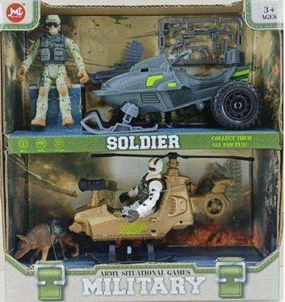 Zestaw wojskowy dla chłopców. W opakowaniu: helikopter, skuter śnieżny, broń, figurki żołnierzy i figurka pieska. Produkt zapakowany w kartonowe opakowanie z przezroczystym okienkiem. Zabawka dla dzieci od 3 lat. Podane wymiary są wymiarami opakowania.