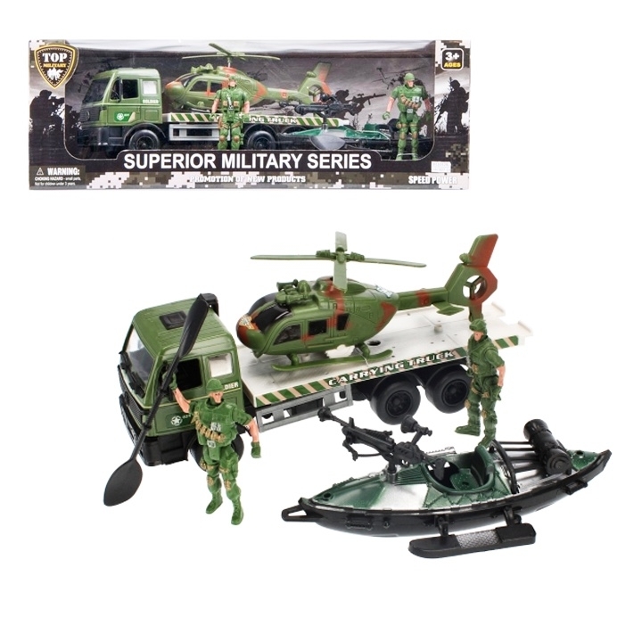 Sada obsahuje: vojenské auto, vrtulník, člun, 2 figurky a vojáka. Rozměry produktu [cm]: 30x13x9, rozměry balení [cm]: 45x16x19, Výrobek je určen pro děti ve věku od 3 let.