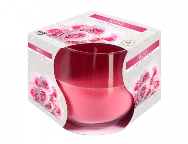Růžová svíčka ve skle s vůní růží, zabalená v krabičce s obrázkem růžových květů. Hmotnost: 100g. číst celé