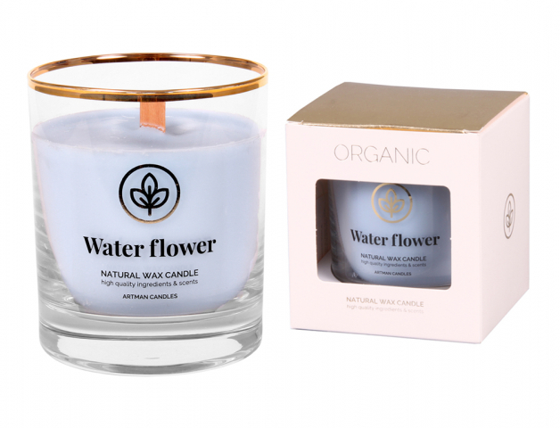 Svíčka z přírodního vosku s vůní vodních květů ve skle. Svíčka je v dárkové krabičce. Hmotnost: 500 g. Výška: 9,5 cm, šířka: 8 cm.
