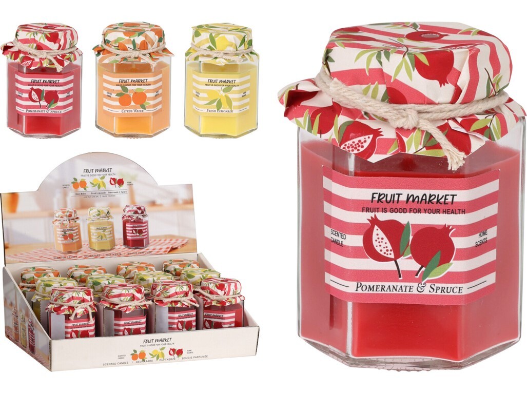 Svíčka ve skle 60x60x80mm vonná s papírovým tištěným víčkem, design mix ovoce, barevná