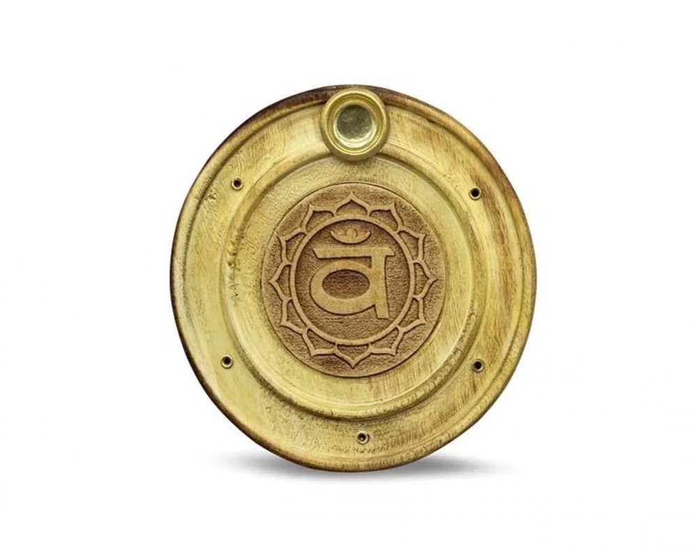 Kulatý stojánek ze dřeva pro vonné tyčinky s bambusovou štěpinou a vonné jehlánky s ozdobou ve formě reliéfu druhé čakry..V našem těle máme 7 základních čaker (energetických center) nacházejících se na určitých místech našeho těla, z nichž každá působí ve své oblasti jak na úrovni tělesné tak, i duševní.SVADHISTANA - sexuální čakra poloha v těle podbřišek oblasti křížové pleteně (vaječníky, prostata). Je centrem původních nefiltrovaných emocí, sexuální energie a tvořivých sil. Při správné funkci druhé čakry nám život působí potěšení, jsme optimističtí, uvolnění, dovedeme se přizpůsobit životním požadavkům. Nesprávná funkce či blokáda energie způsobí nedostatečné přijetí sama sebe, sebelásky a ega.Průměr: 10 cm