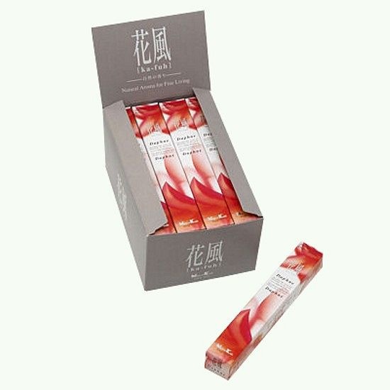 Japonské vonné tyčinky Nippon KAFUH Daphne, to jsou velmi kvalitní tyčinky, vyráběné čistě přírodními postupy, představují podmanivou vůni květů lýkovce vonného - vynikají svou silnou, pronikavou květinovou vůní, připomínající vůni pivoňky. Tyčinky se dají dobře využít v malých prostorách pro svoje neagresivní vonné vlastnosti, při pálení nevzniká téměř žádný dým. Výborně se hodí k nastolení harmonie a klidu.