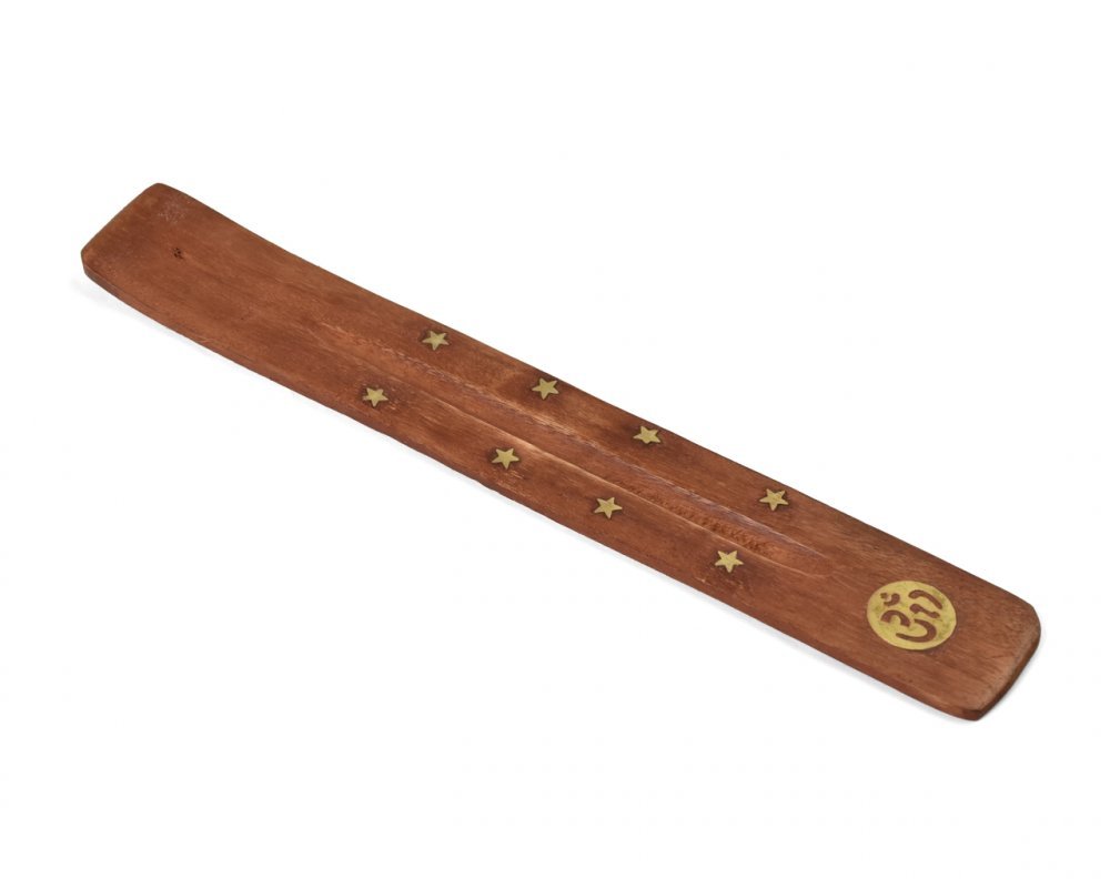 Dřevěná hnědá lyže na vonné tyče.Délka cca 26 cm, šířka cca 3,5 cm. Barva dřeva a typ znaku ÓM se může lišit, jedná se o ruční výrobu. číst celé