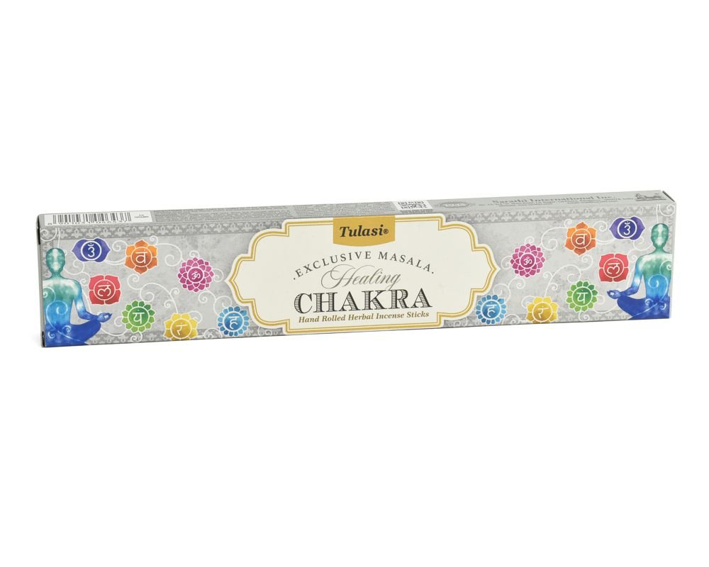 Tradiční indické vonné tyčinky Tulasi Exclusive Masala Healing Chakra s vyváženou vůní pro stimulaci čaker. Vůně je nasládlá s jemnými dřevitými podtóny. Jedná se o kvalitní vonné tyčinky s vysokým podílem přírodních příměsí.