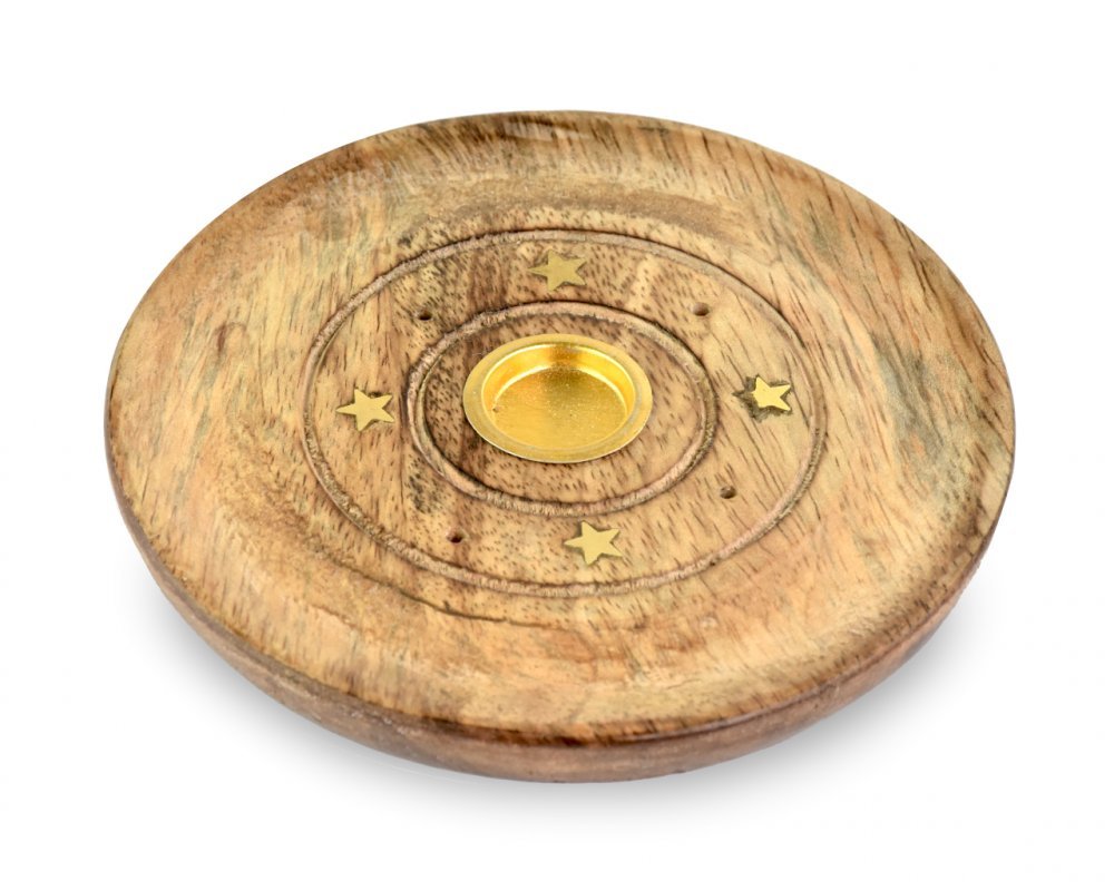 Kulatý stojánek ze dřeva pro vonné tyčinky s bambusovou štěpinou i jehlánek. Zdobený kovovým dekorem.Průměr: 9,5 cm číst celé