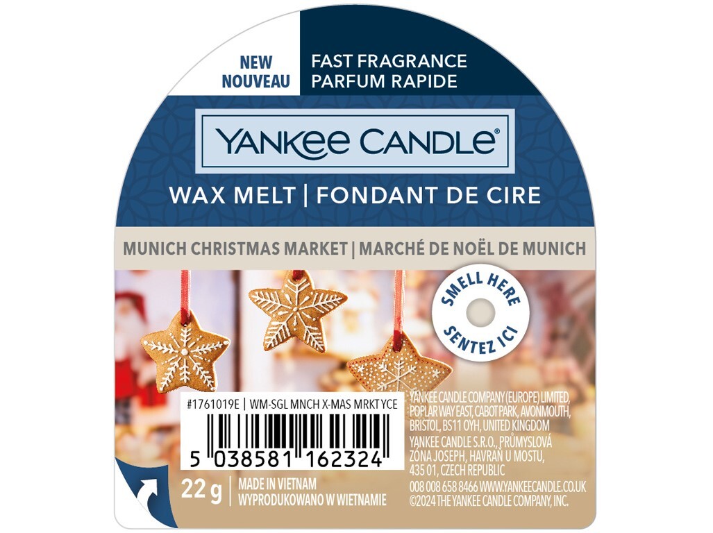 YANKEE CANDLE Munich Christmas Market vonný vosk do aromalampy vás rychle obklopí kouzelnou vánoční vůní, která zútulní váš byt nebo dům. Užijte si dlouhotrvající svěžest a příjemné aroma bez nutnosti zapalovat svíčky.