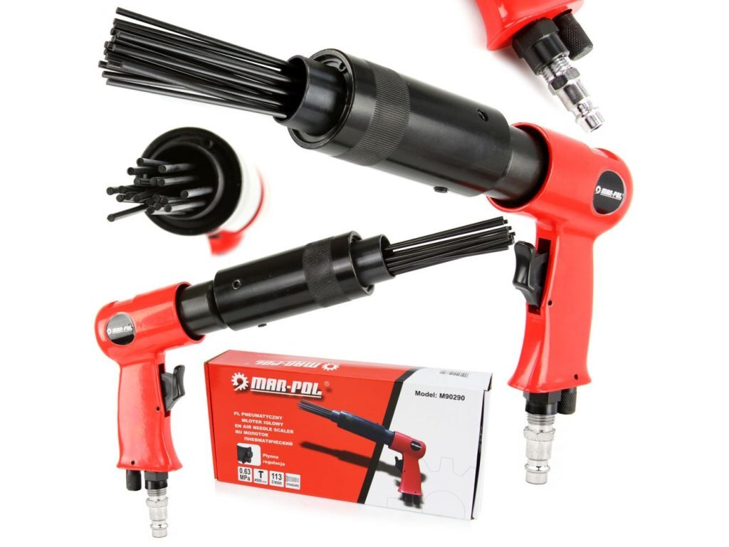 Profesionální, pneumatické jehlový oklepávač, nenahraditelný ve většině prací souvisejících s kovoobráběním, jak v malých dílnách, tak ve velkých výrobních závodech.