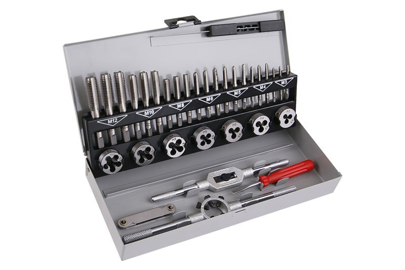 Sada sadových závitníků a závitových oček v plechovém boxu. Součásti balení: sadové závitníky M3 - M12, závitové očka M3 - M12, vratidlo pro závitová očka 25 x 9mm, stavitelné vratidlo pro ruční závitníky M3 - M12, závitová měrka, šroubovák. Sada obsahuje výběr nejpoužívanějších rozměrů...