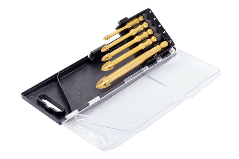 sada speciálních vrtáků pro přesné a rychlé vrtání do skla, keramiky, tvrdé dlažby a obkladů a jiných extrémně tvrdých materiálů nejen ve stavebnictví
