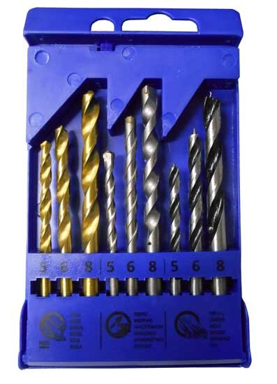 Sada vrtáků 9ks s válcovou stopkou: Vrtáky do dřeva 5,6,8mm Vrtáky do zdiva 5,6,8mm Vrtáky do kovu 5,6,8mm