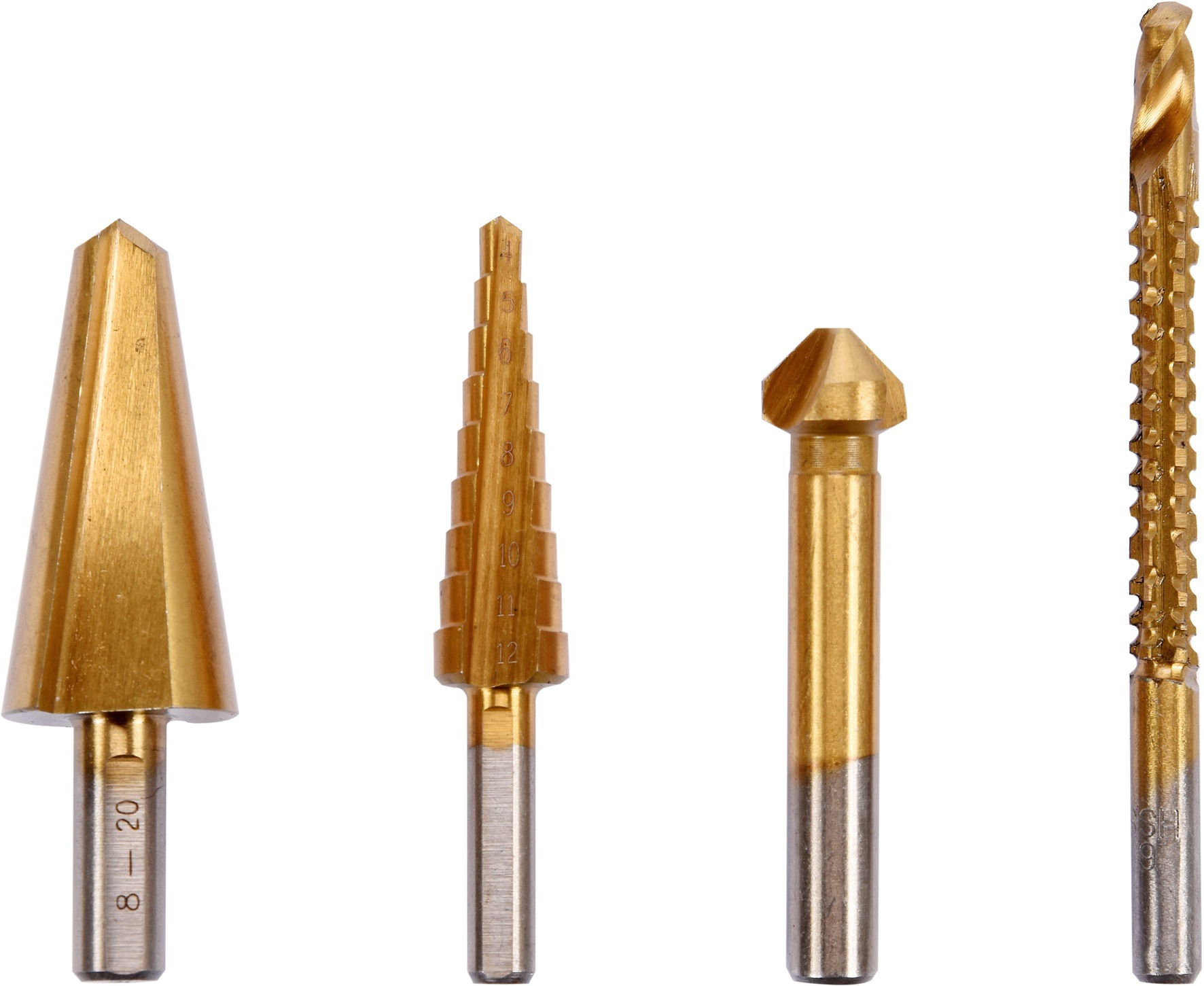 Sada zahrnuje výstružník, zahlubník, stupňovitý vrták a frézový vrták.