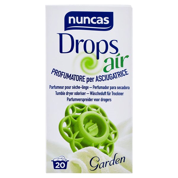 Nuncas Air Drops je revoluční technologie v podobě voňavého plastu, který v sušičce pomáhá k rychlému sušení prádla díky svému speciálnímu tvaru a zároveň obsahuje speciální parfém, který se začne postupně do prádla uvolňovat a voní i dlouho po jeho usušení. Díky produktu Nuncas Air Drops bude prádlo rychleji v sušičce vysušeno a zároveň bude velice příjemně a dlouho parfemováno.