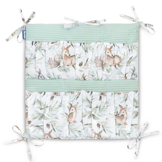 Organizer na łóżeczko Wafel to nie tylko praktyczny produkt, który ułatwi opiekę nad niemowlęciem, ale także ozdoba pokoiku dziecięcego. Posiada 5 kieszeni wzmocnionych gumką, które pomieszczą wszystkie niezbędne akcesoria. Górne kieszenie mają wymiary ok. 15 cm x 15 cm, dolne – 24 cm x 18 cm....